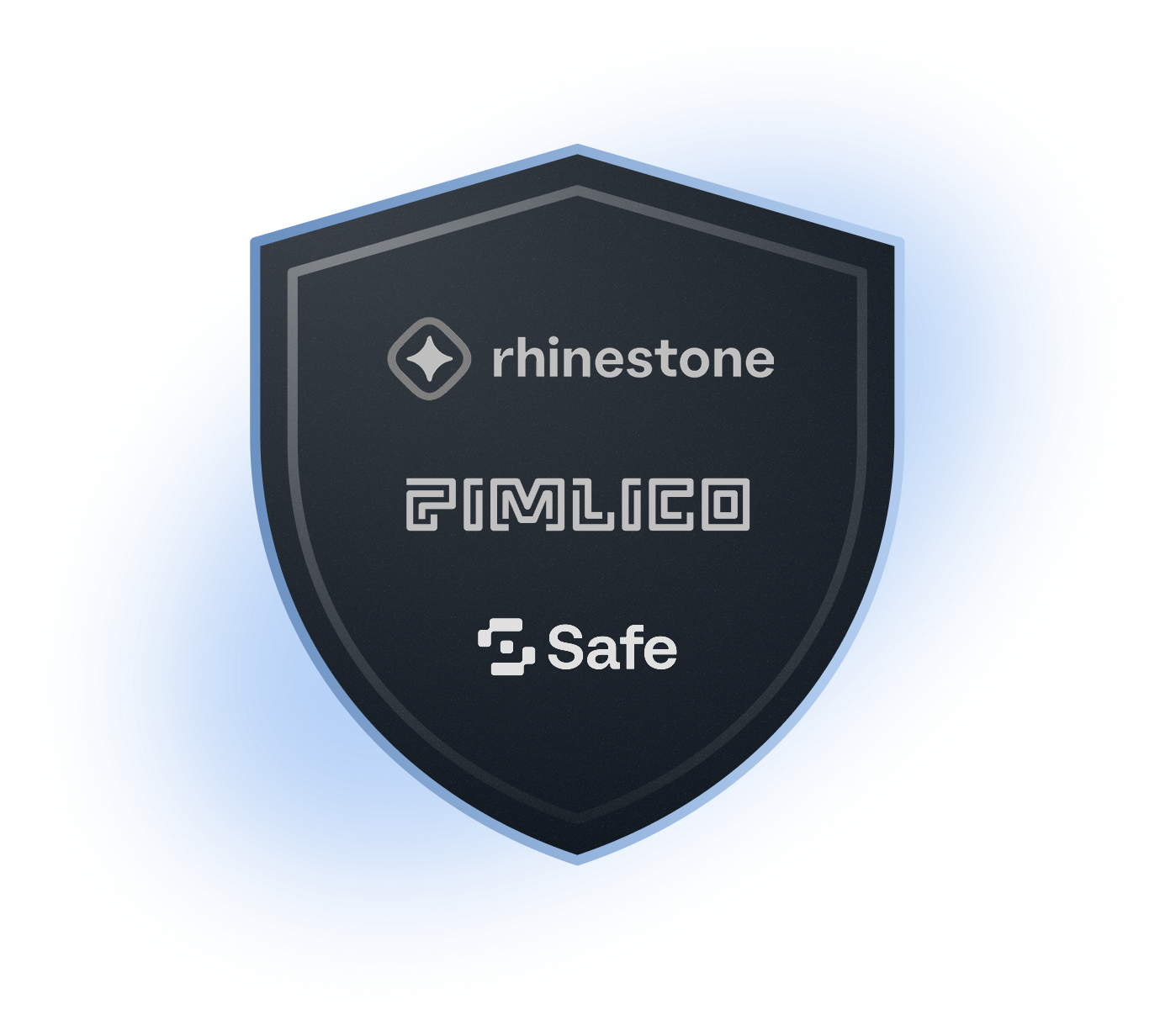 All smart wallets use Rhinestone, Pimlico & Safe: SmartSession for seamless sessions and Safe7579 for full ERC-7579 compatibility